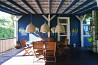 Благоустроенный озеленённый двор, территория обнесена забором, терасса,