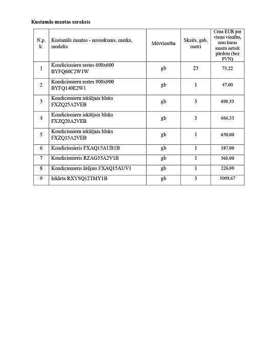 Cenu aptaujā tiek pārdoti kondicionieri un to komponentes, kas kopš 2022. gada decembra atrodas būvniecības objektā. Kustamā manta atrodas ēkas pirmajā stāvā. Cenu aptaujas uzvarētājam jāorganizē kustamās mantas izvešana no būvniecības objekta. Personām, kuras vēlas iegādāties kustamo mantu, pēc cenu aptaujas izsludināšanas, klātienē ir iespējams iepazīties ar tās stāvokli, iepriekš vienojoties par apskates laiku, zvanot pa tālruni + 371 67000444 vai rakstot uz e-pastu: info@bib.eu. Maksātnespējīgā kredītiestāde Baltic International Bank SE nedod garantiju un nenes atbildību par iespējamajiem defektiem, kas atklājas pēc kustamās mantas iegādes.