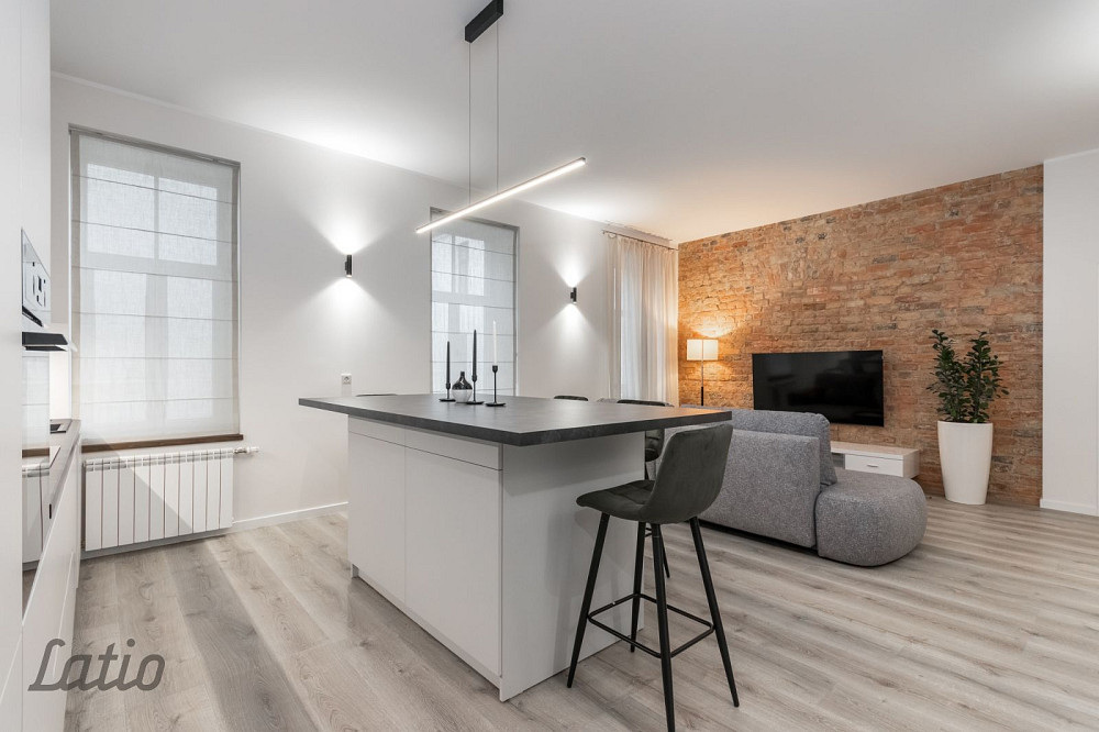 Dzīvoklī ir viesistaba apvienota kopā ar virtuvi,