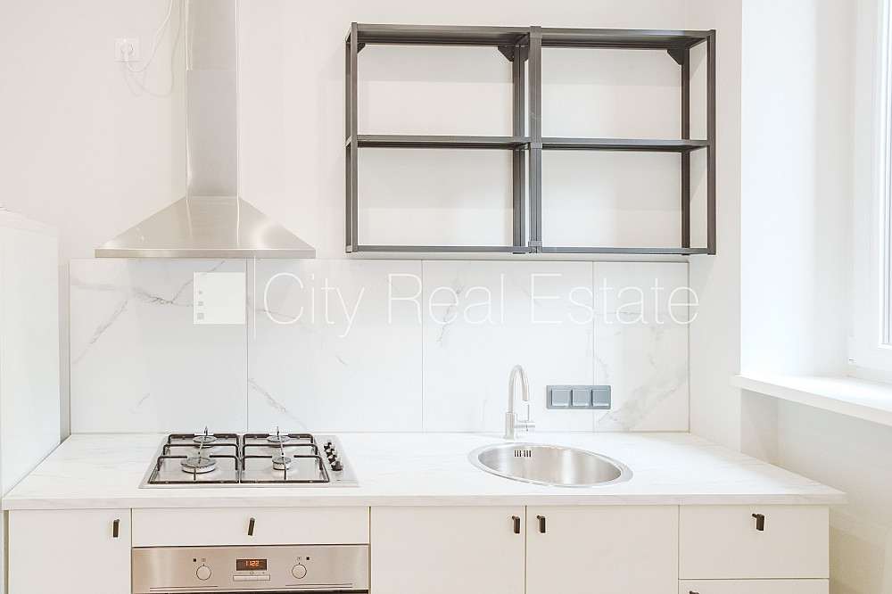 Фасадный дом, лестничная клетка после косметического ремонта, одна изолированная комната, студио, кухня объединена с гостинной, гардеробная, центральное отопление, новая сантехника, совмещённый санузел, ванна, встроенная кухня, диван, двуспальная кровать, кухонный стол, журнальный столик, кухонные стулья, шкаф, холодильник, духовка, газовая плита, вытяжка, стиральная машина, освобождена, CITY REAL ESTATE ID - 517597