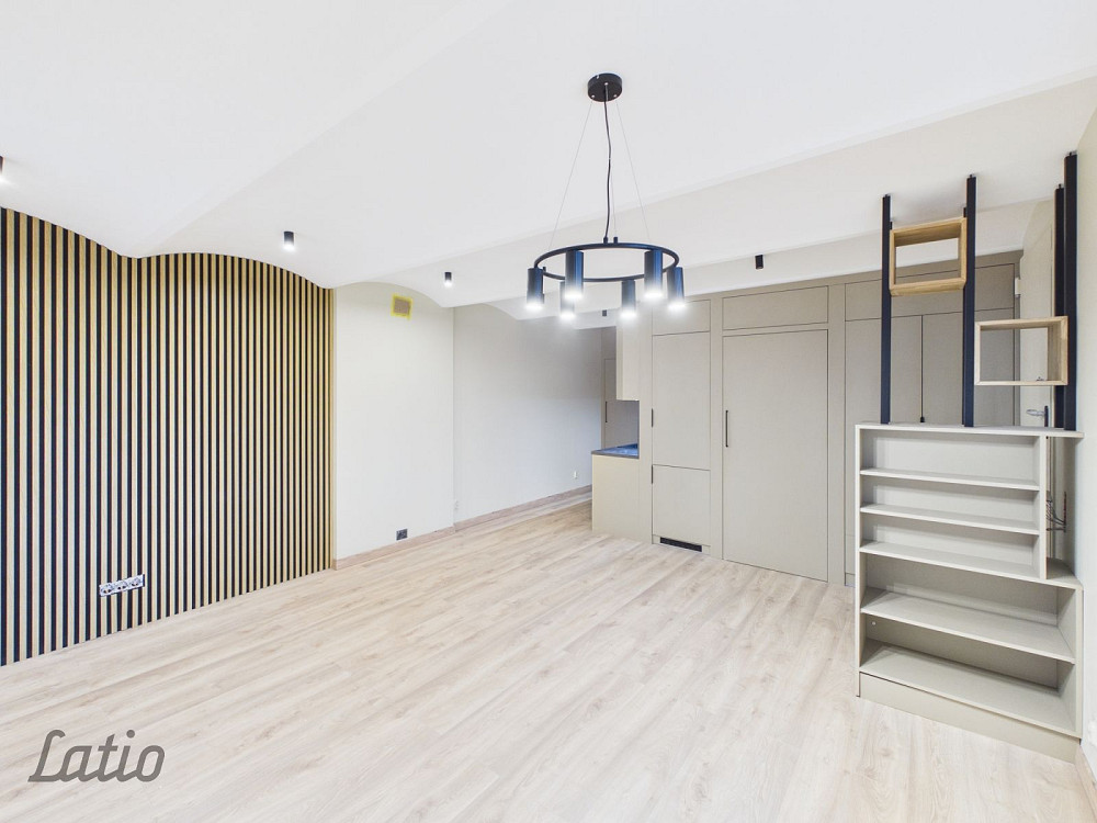 Pārdomāta telpa: Plaša studijas tipa viesistaba, kas apvienota ar virtuvi, un viena pilnībā izolēta, klusa guļamistaba.