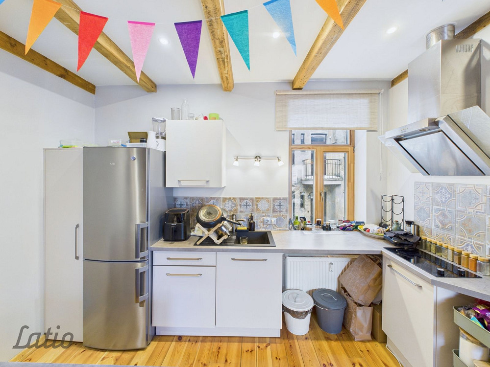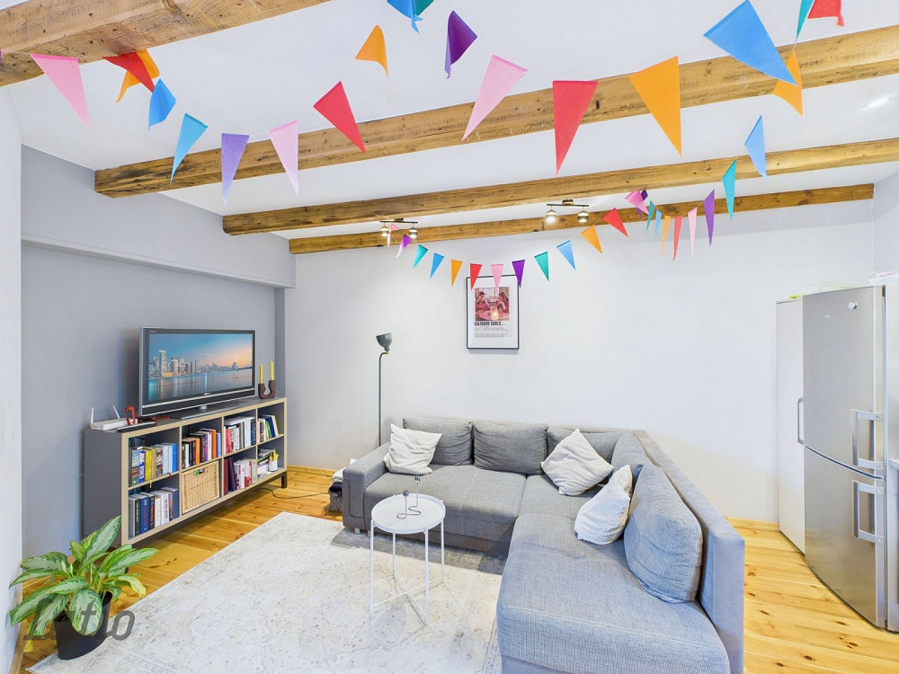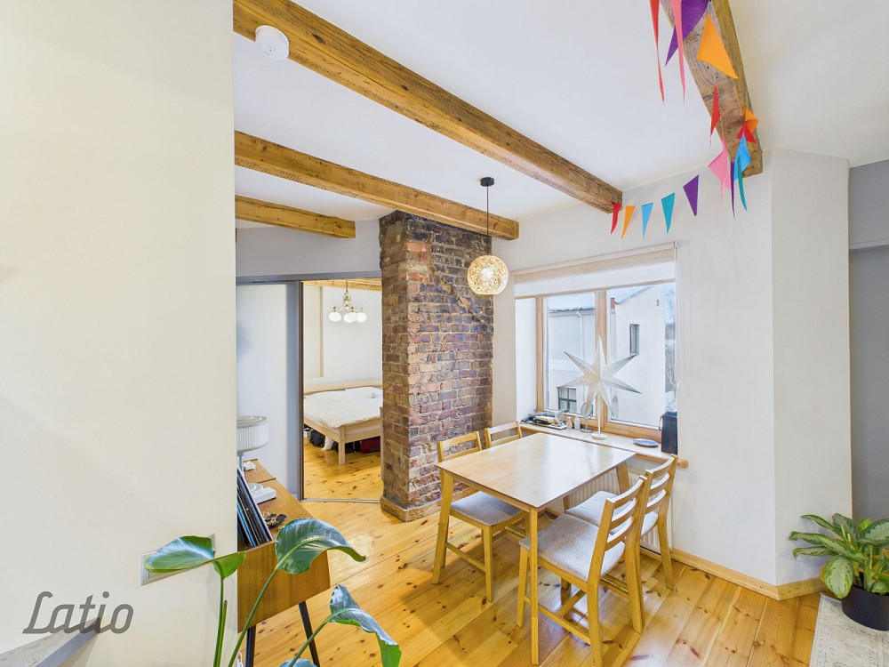 Māja un dzīvoklis pilnībā renovēti 2020. gadā. Interjerā saglabāti autentiski elementi atjaunotas koka griestu sijas, ķieģeļu sienas un priedes grīdas, kas piešķir īpašu raksturu.