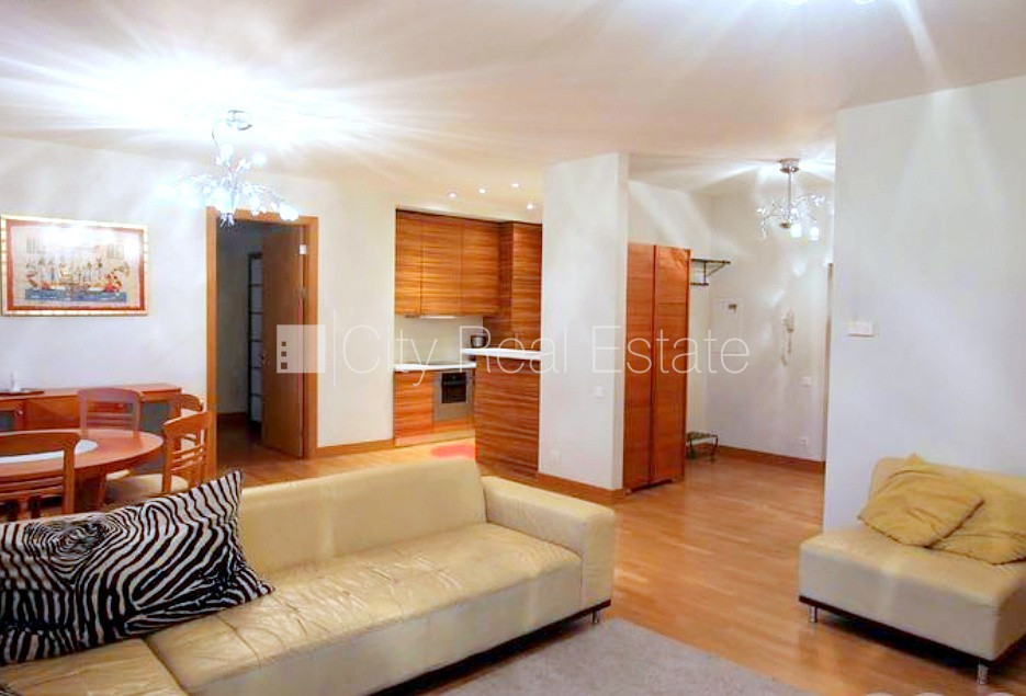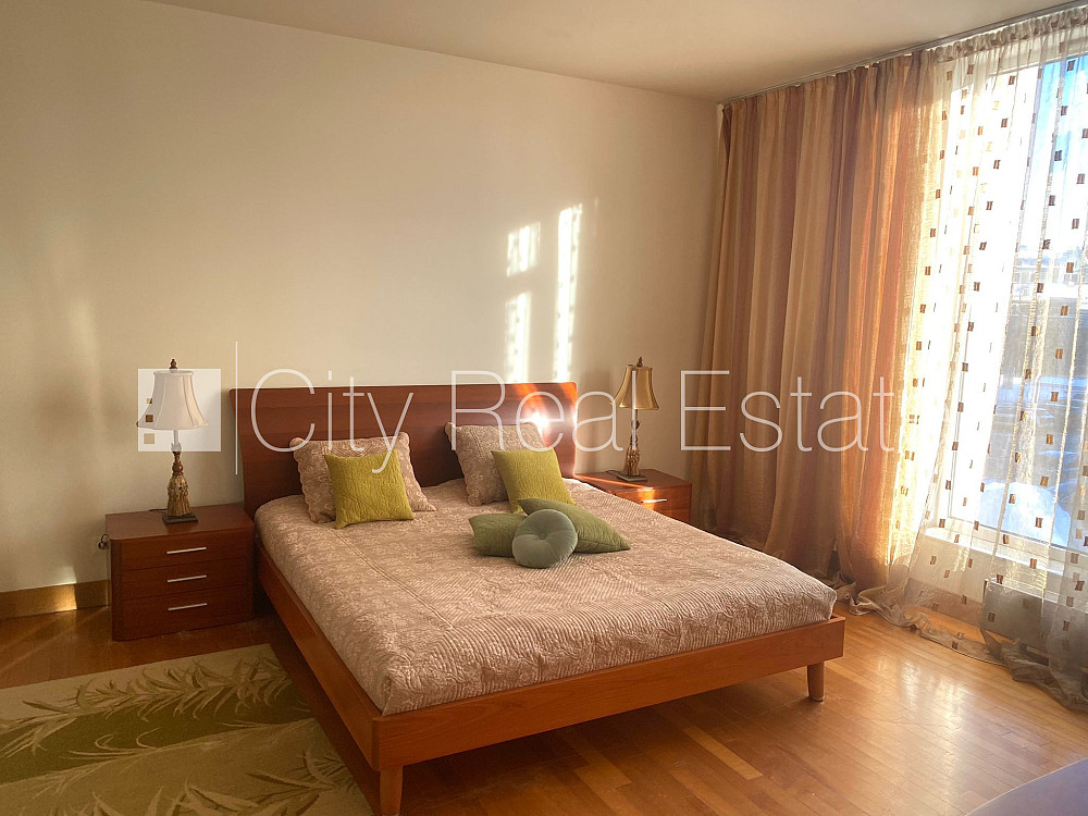 Проект - Centra Nams (Центра Намс), новостройка, благоустроенный озеленённый двор, подземная стоянка, система кондиционирования воздуха, количество спален 2 шт., изолированные комнаты, студио, кухня объединена с гостинной, гардеробная 4.87 м2, покрашенные стены, новая сантехника, паркетный пол, два санузла, ванна, душевая кабина, встроенная кухня, двуспальная кровать, гостинный стол, кресла для отдыха, шкаф для одежды, телевизор, холодильник, электрическая плита, духовка, вытяжка, стиральная машина, круглосуточная охрана, закрытая лестничная клетка, CITY REAL ESTATE ID - 517979