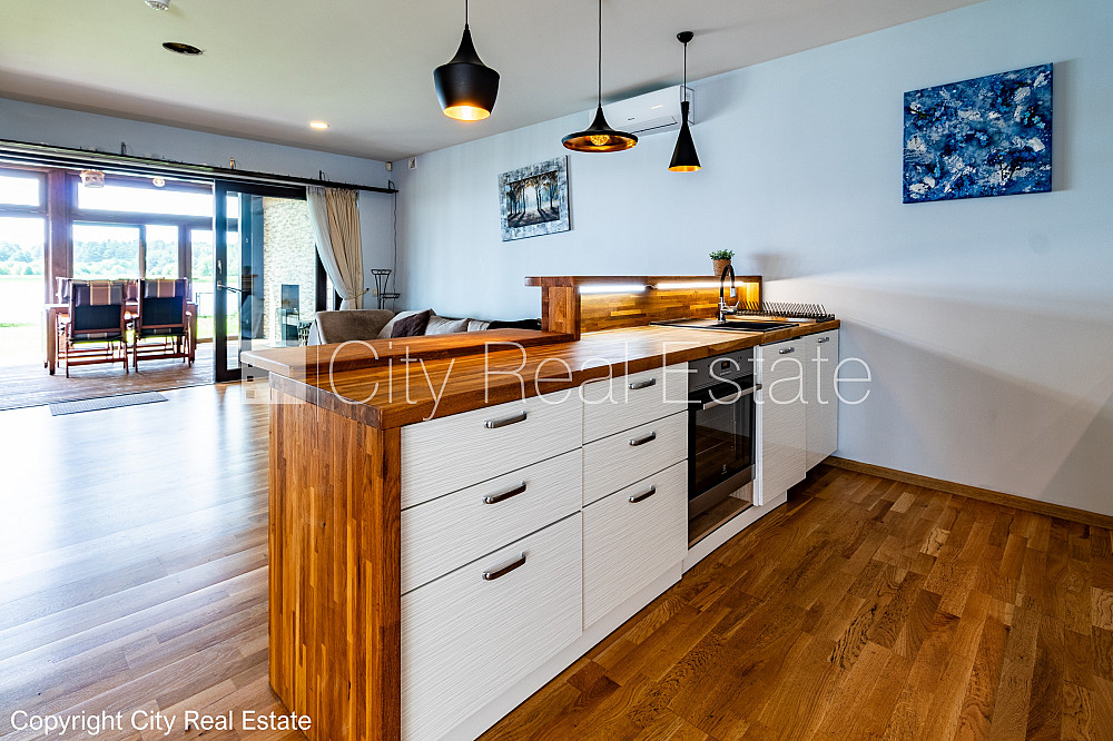 Частный дом, благоустроенная озеленённая территория, территория обнесена забором, въездные ворота оснащены автоматической подъёмной системой, место для машины, терасса, веранда, двухэтажный, изолированные комнаты 1 шт., студио, кухня объединена с гостинной, кухня 2 шт., несколько входов, камин, газовое отопление, бойлер для горячей воды, большие витрины, деревянные стекло-пакетные окна, ламинатный пол, кафельный пол, два санузла, душевая кабина, встроенная кухня, встроенные стенные шкафы, кондиционер, холодильник, электрическая плита, духовка, вытяжка, стиральная машина, сдаётся со всем видимым на фотографии оборудованием, освобождена, рядом с рекой, рядом с морем, лодочная пристань, стратегически выгодное место, CITY REAL ESTATE ID - 516174