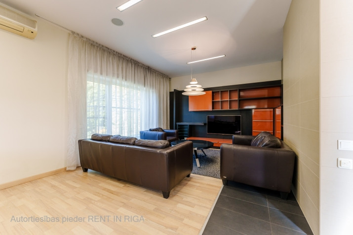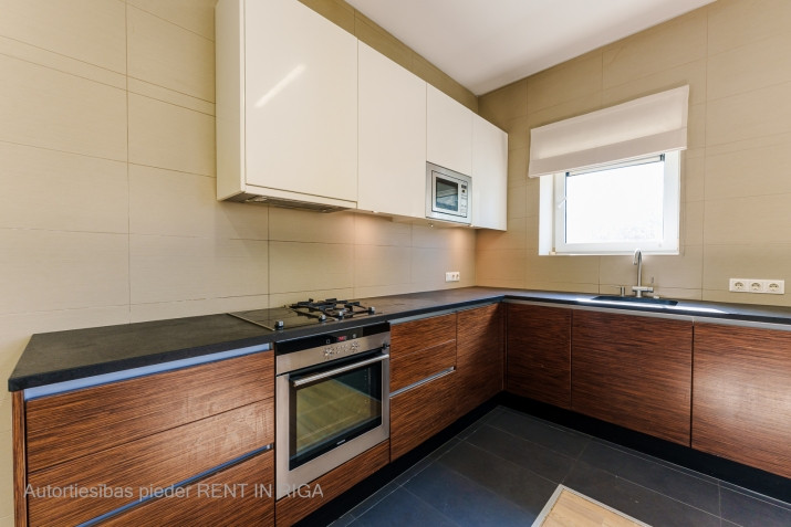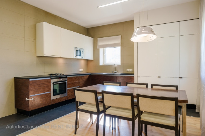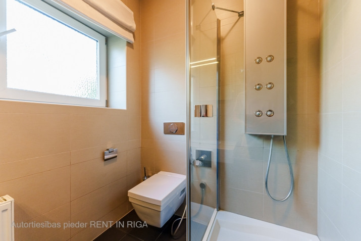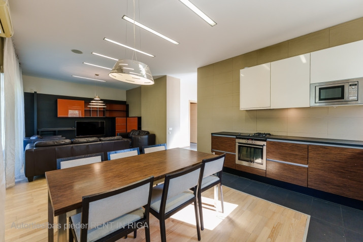 Сдается в аренду полностью меблированная часть таунхауса в Дарзциеме. Планировка дома: Первый этаж - кухня, совмещенная с просторной гостиной, из которой есть выход в зеленый двор, гостевой санузел и гараж (на одну машину). Второй этаж - три спальни, одна из них с гардеробной и две ванные комнаты.