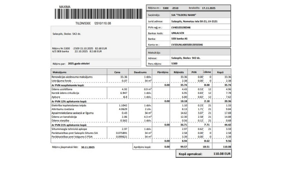 Домом управляет SIA Tilderu nami, счета составляют около 90 евро круглый год, плюс вода и отопление (которым можно практически не пользоваться);